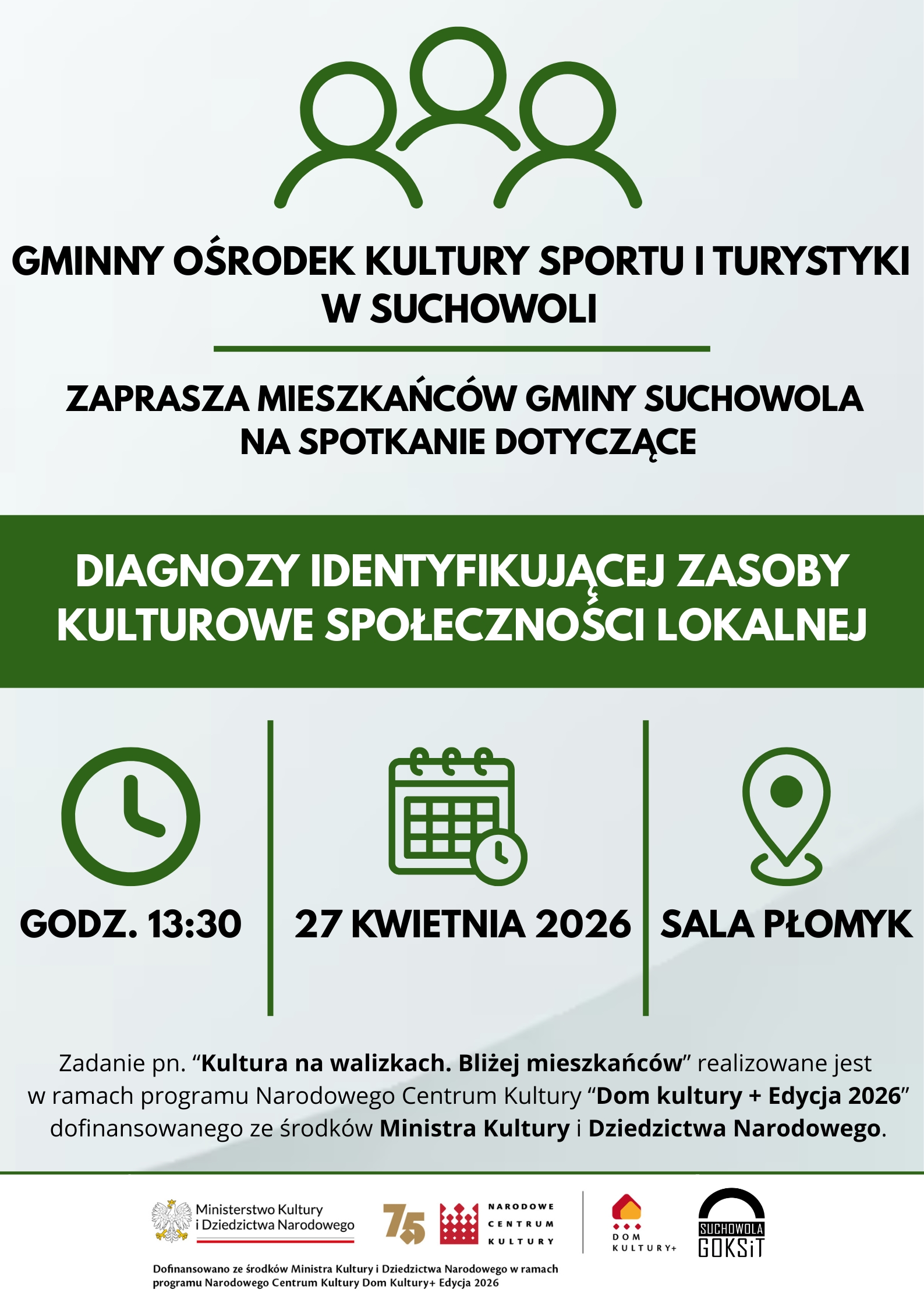 Drodzy Mieszkańcy! Zachęcamy Was serdecznie do wypełnienia krótkiej, anonimowej ankiety przygotowanej w ramach projektu „Kultura na walizkach. Bliżej mieszkańców” - dofinansowanego ze środków Ministra Kultury i Dziedzictwa Narodowego w ramach programu Narodowego Centrum Kultury “Dom Kultury + Edycja 2026, Inicjatywy Lokalne”. Ankieta dotyczy Waszych potrzeb, oczekiwań i zainteresowań związanych z ofertą kulturalną w naszej gminie.… Continue Reading DOM KULTURY+ EDYCJA 2026, INICJATYWY LOKALNE ANKIETA